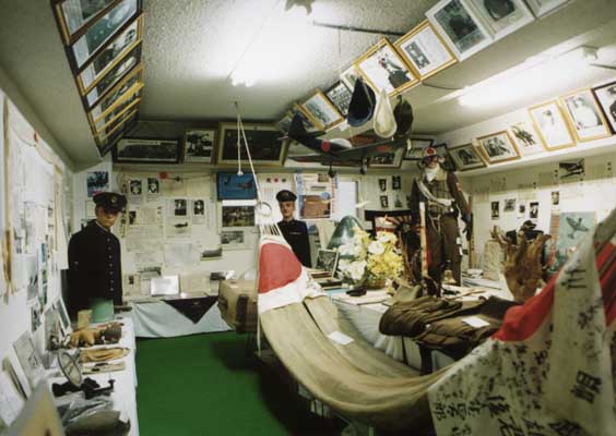 | 大分市・上野丘にある「大分予科連資料館」。館主の川野喜一さんは「悲惨な戦争を二度と繰り返してはいけない」との思いからこの資料館を作ったという。玄関横にはゼロ戦のプロペラと朝日新聞の旗、軍艦の形をした松の盆栽などがあり、自宅地下の資料館にはナント約3000点の戦利品、いや予科連コレクションが並べられている。もちろん館内BGMは軍歌。来たれ、戦争を知らぬ若人たちよ! |